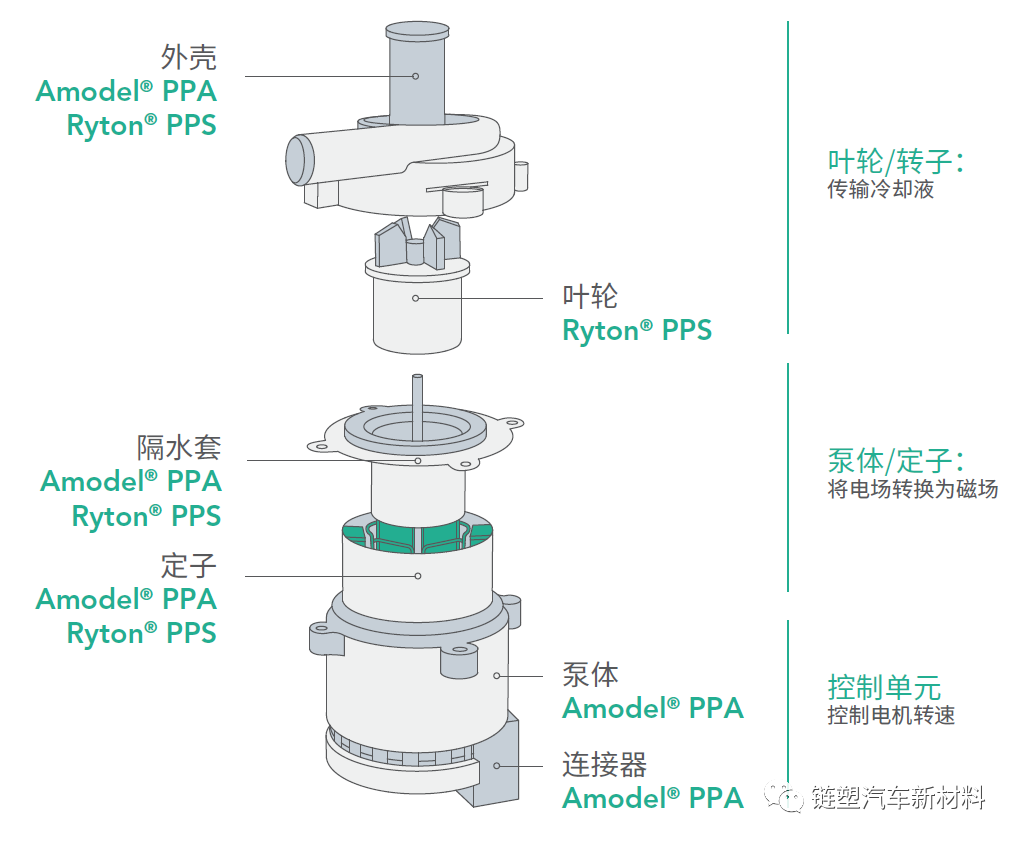 ●电子水泵壳体:处于冷却液和热循环工况下,相关部件材料需要出色强度、低吸湿性和耐热性。