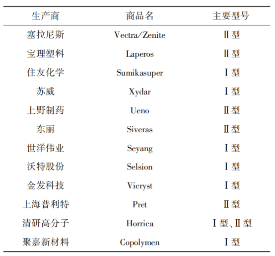 目前,全球有聚合能力的生产企业主要集中在美国和日本,各大公司主要型号的液晶高分子产品类型见表1。