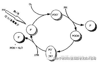 PP在加工过程中,PP材料受到螺杆和料筒的剪切挤压等机械应力作用下,大分子链上的碳-碳化学键发生均裂,造成分子链断裂,同时在高温下,热也会造成分子链的断裂。这两方面的原因直接导致了PP的降解。而在使用过程中,空气中的氧气会进攻聚丙烯分子链上C-H而生成自由基,同时加上在加工过程中由于分子链断裂形成的大分子碳自由基,在氧气的作用下,会进一步与氧反应形成氢过氧化物,而氢过氧化物是不稳定的,会进一步分解形成RO·等含氧自由基和·OH氢氧自由基,相当于增加了自由基浓度,反应速度自动加快,形成了自动氧化反应(如下图),加快了PP的降解,造成材料的相对分子质量下降,在材料物理性能上表现为断裂强力和断裂伸长率的下降。