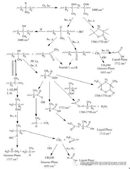 众多的研究表明,太阳光,特别是波长较短的紫外线,它的能量能切断PP的分子链,并在氧的作用下引发光氧化反应,且PP的最敏感波长为300nm,导致PP的抗光氧老化性能非常差。特别是对于PP纤维或薄膜类制品,由于质薄,与紫外光和氧接触的面积相对更大,因此,更容易发生光氧老化而降解。PP的光氧老化是按照于类似游离基链式反应的方式进行,其老化后会产生羰基化合物,而羰基能吸收260~340nm的紫外光,并参与发生多种光化学反应,进而引发PP分子链发生断裂。Gardette等对PP的光氧老化机理和反应进行了总结,如下图所示。